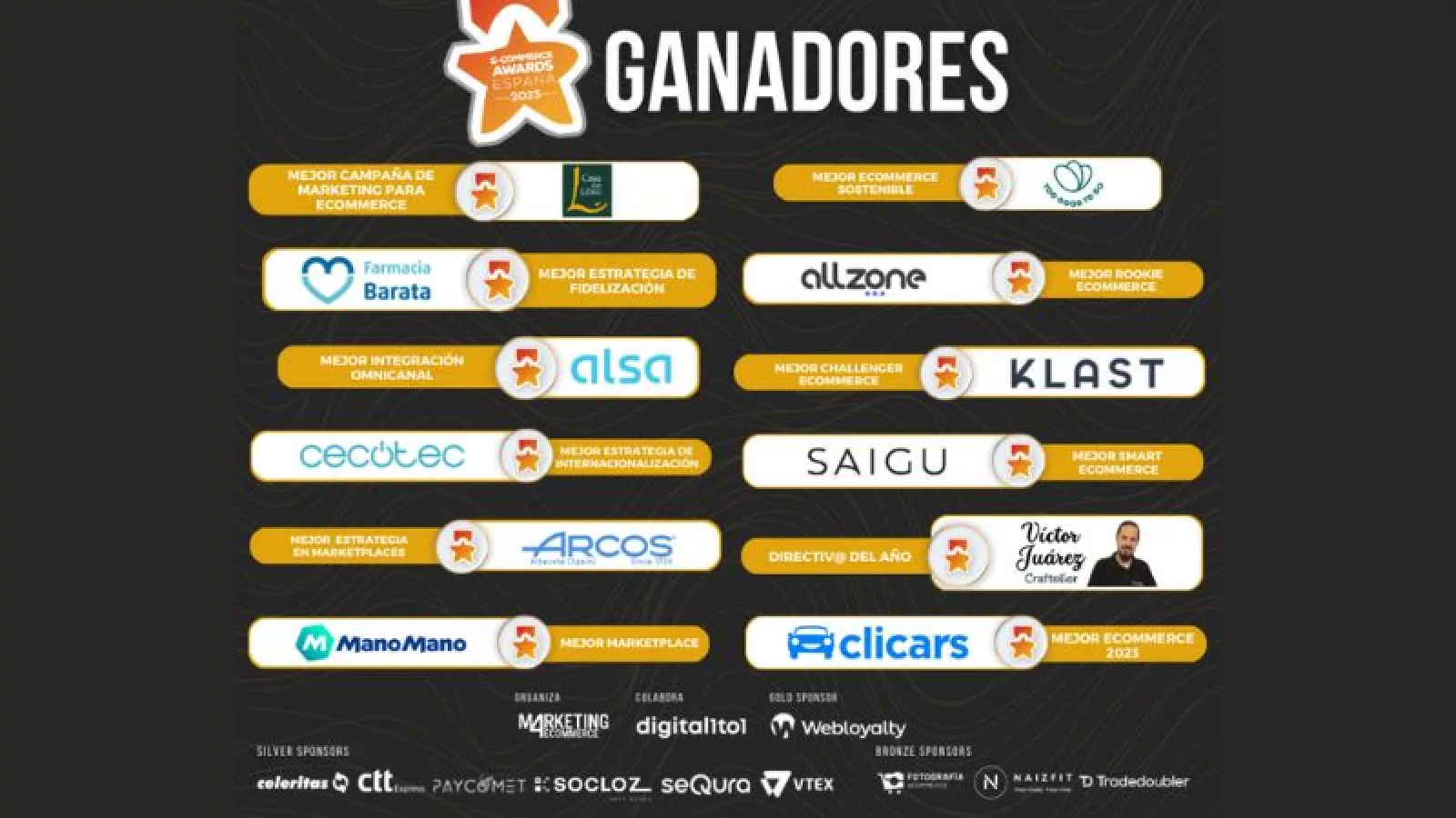 Estos premios de 2023 contaron con Webloyalty como patrocinador Gold Sponsors. Acompañaron también como Silver Sponsors: Celeritas, el operador español especializado en logística para eCommerce con una red de más de 4.000 puntos de recogida; CTT Express, la empresa de paquetería urgente con una amplísima red de reparto a nivel ibérico; Paycomet, plataforma de pagos referencia en el sector; SeQura, el método de pagos aplazado para eCommerce; SoCloz, plataforma de transformación omnicanal, y, por último, Vtex, la plataforma todo en uno de comercio digital, que son nuestros Silver Sponsors este año. ¡Muchas gracias!