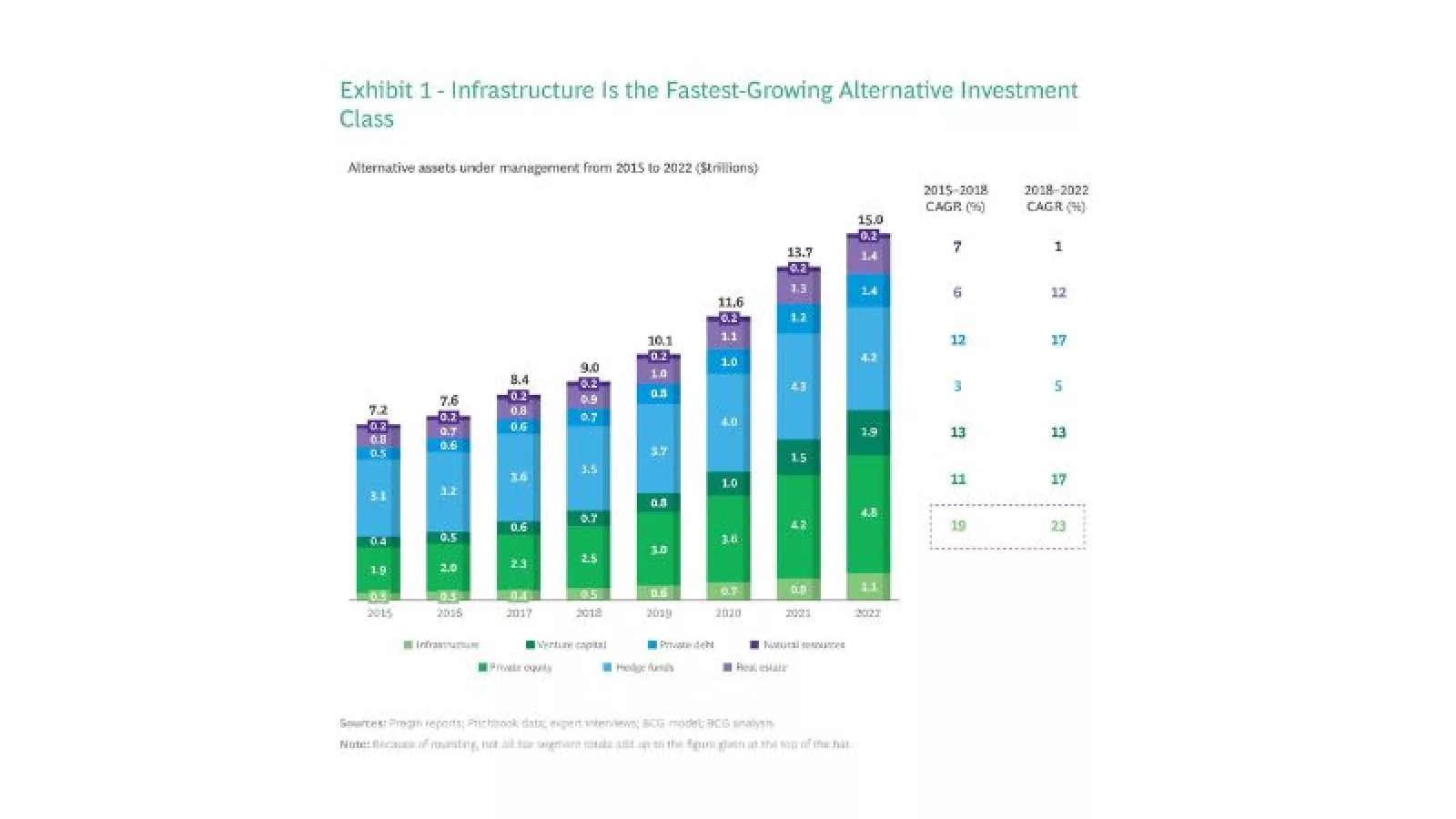 Esto explica por qué la captación de fondos creció un 50% en 2021 respecto al año anterior, mientras que las inversiones en otros activos alternativos, como bienes raíces (-25%), private equity (-21%), deuda privada (-10%) y capital riesgo (9%), aumentaron a un ritmo mucho más lento. Actualmente, los inversores en infraestructuras gestionan activos por valor de 1,1 B $ en los sectores de energía y medioambiente, transporte y logística, e infraestructuras digitales y sociales. Según un estudio internacional de fondos de inversión en infraestructuras realizado por Boston Consulting Group (BCG) y EDHECinfra en el tercer trimestre de 2022, el 67% de los directores generales afirmaban que preveían aumentar sus inversiones en el sector de energías renovables en los próximos tres a cinco años.